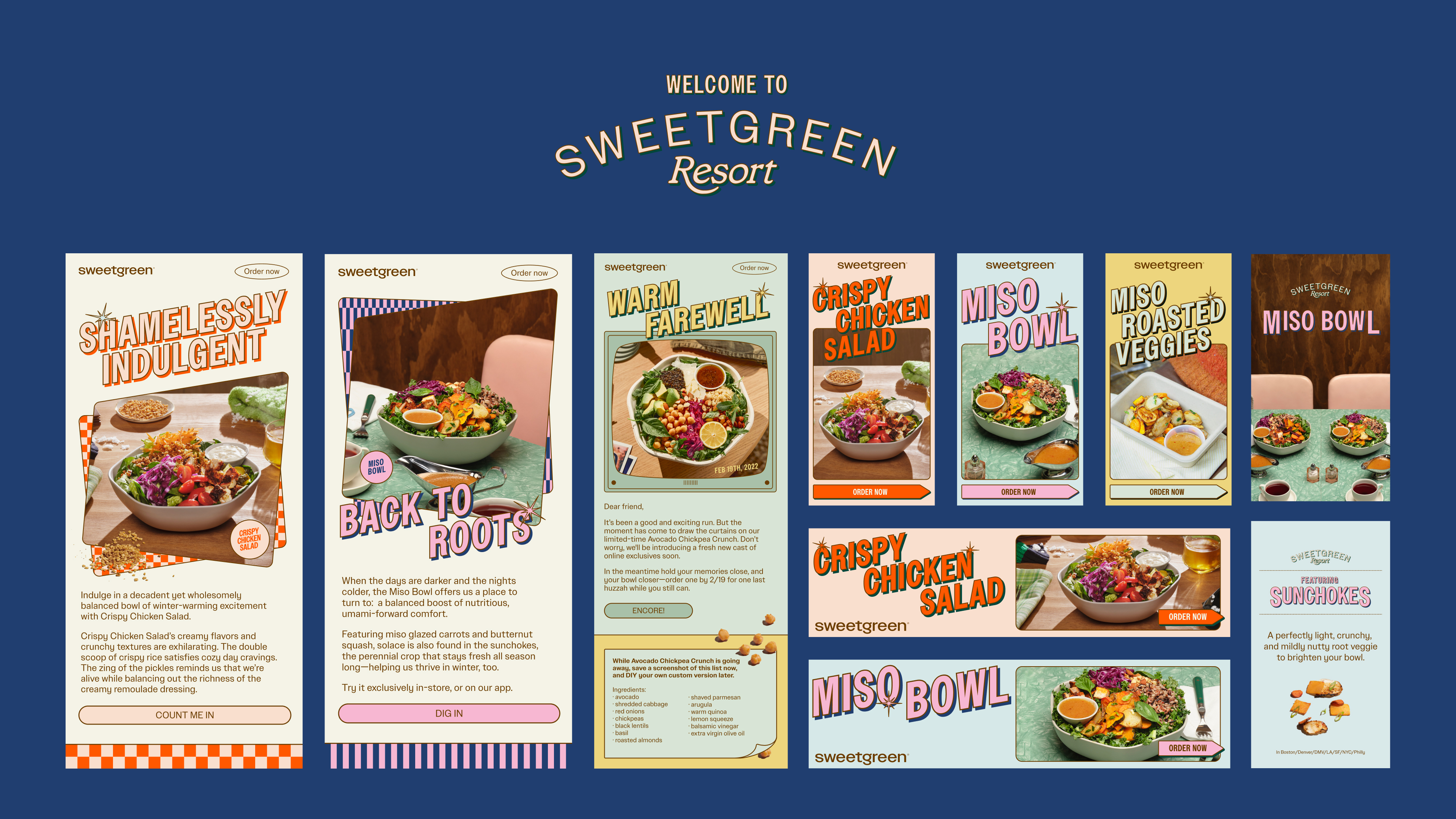 In order to visualize sweetgreen being the winter destination, design and art direction weigh in to create a whole new visual language. Setting sweetgreen itself as the winter resort with a retrospective asetheic of the 1950s and 60s, this new language system include assgining colors and patterns for each item as well as creating unique type treatment. Art direction also maintain props, wardrobes, and all production details correlate with the winter and resort setting.